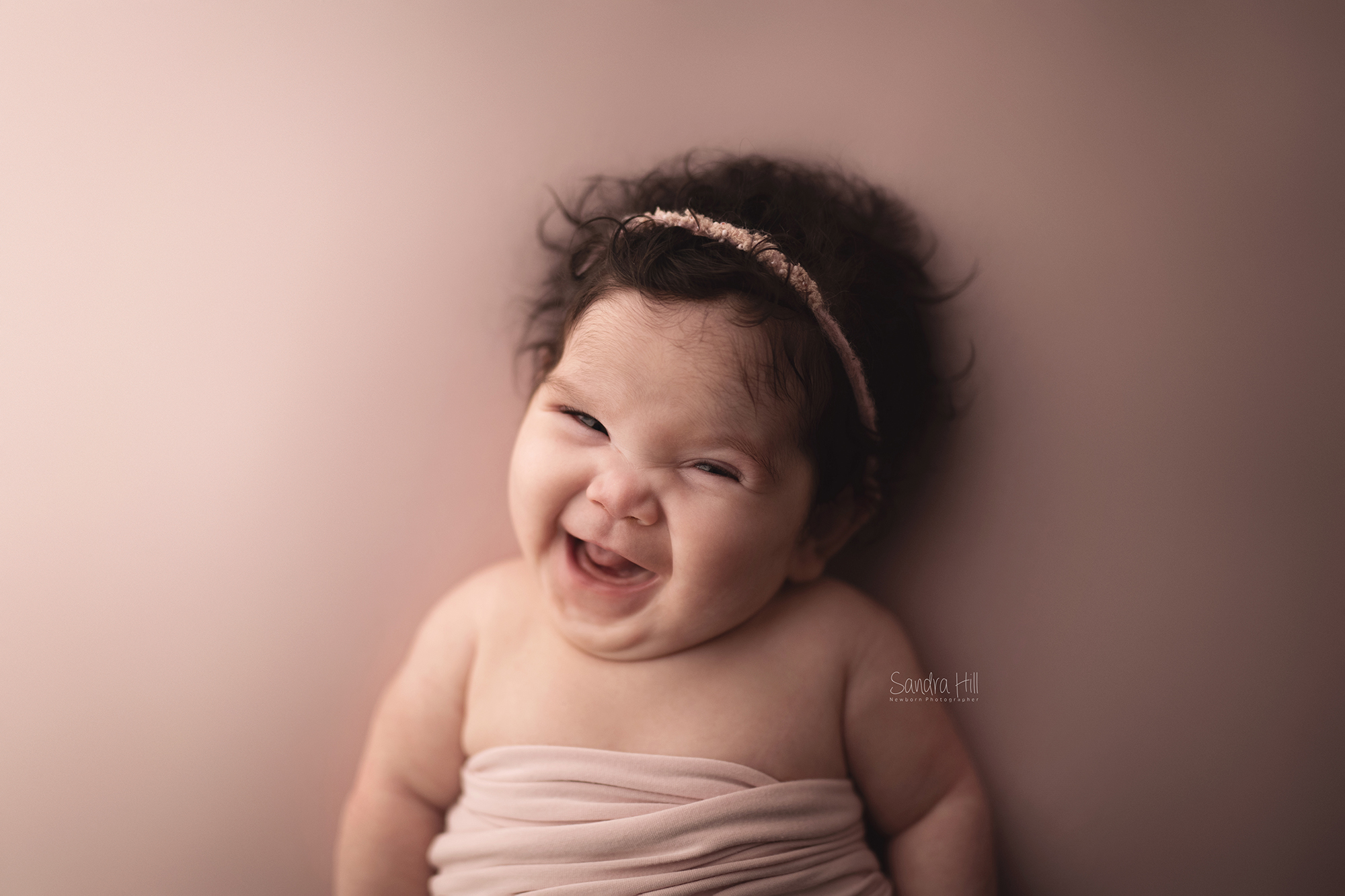 The subtle, pastel hue enhances the delicate and serene feel of the newborn portrait, adding a touch of sweetness and elegance to the overall composition.