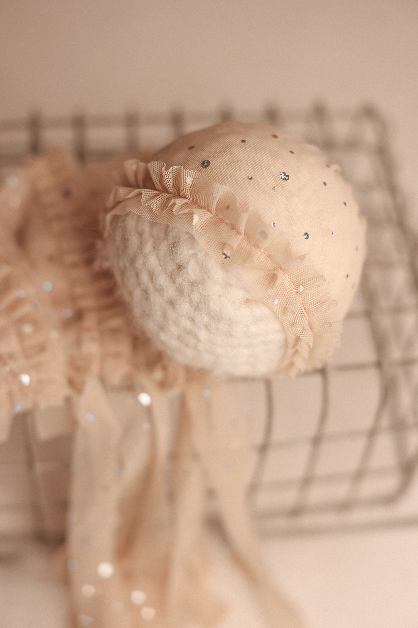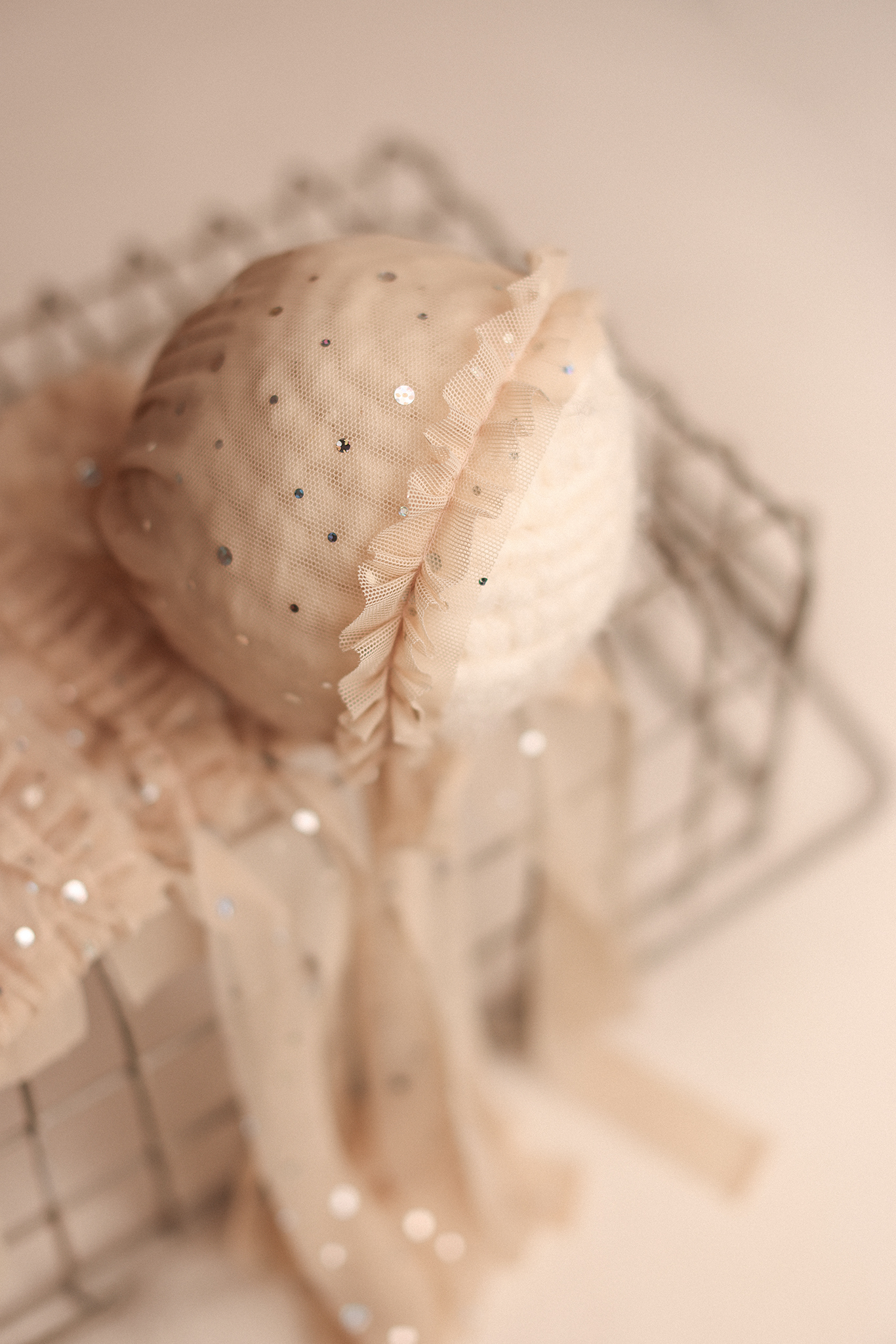 A beautifully minimal newborn outfit set made from soft, natural fabric. Featuring a cozy bonnet and a buttoned top with delicate detailing, this set is perfect for creating warm, timeless newborn portraits.