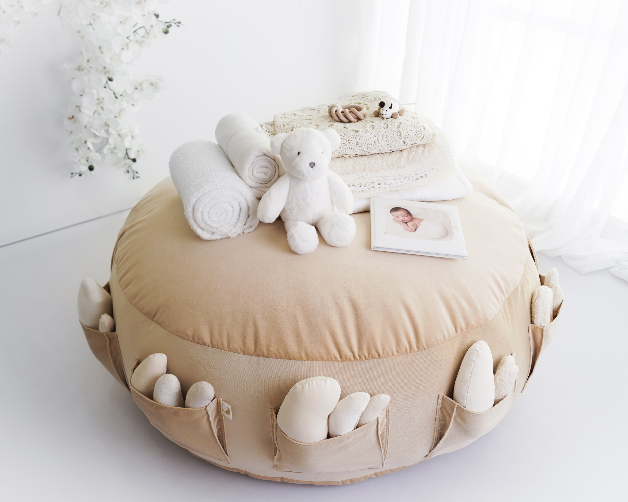 Designed with ease in mind, the bean bag includes two sturdy handles for effortless moving and repositioning during sessions. Around the sides, you’ll find five large silk-lined pockets, perfect for keeping beans, white noise, memory cards, and all those little essentials right within reach.