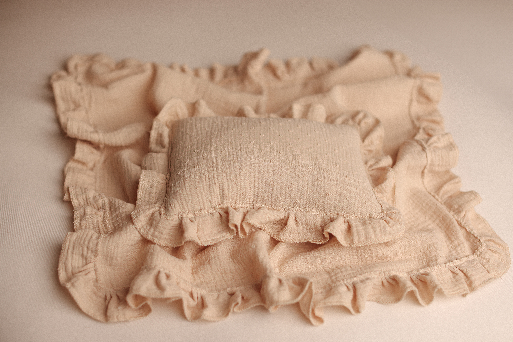 Made from lightweight fabric in a warm light beige color, this set includes a matching mini pillow and a layer adorned with gentle ruffles along the edges. It brings a touch of vintage sweetness to your setups while keeping a natural, neutral aesthetic that photographs beautifully in any light