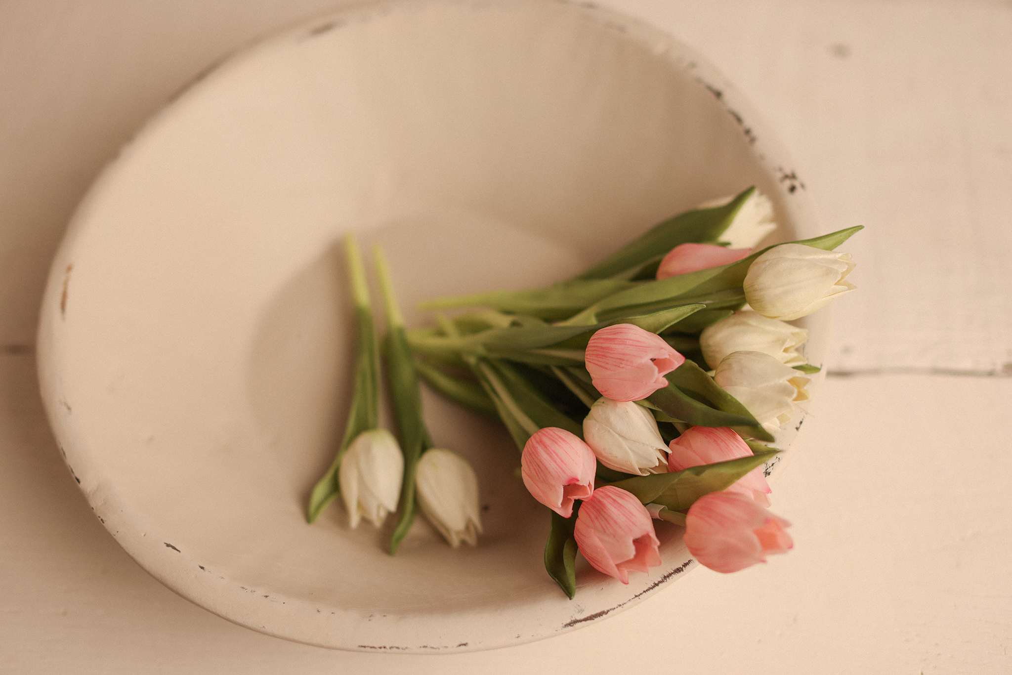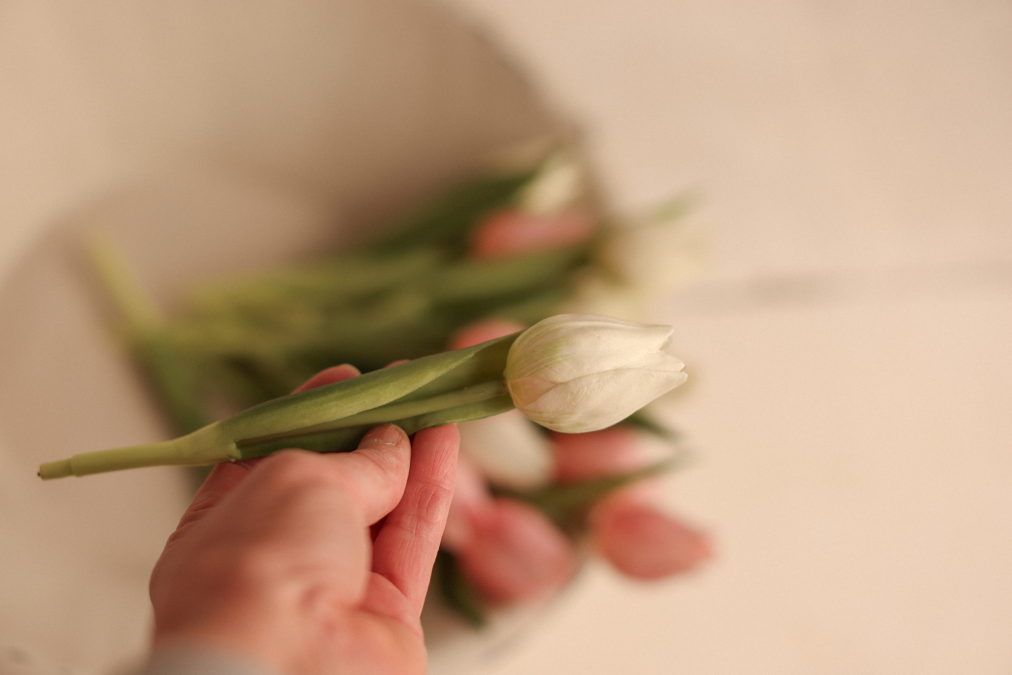 These delicate faux tulips bring the beauty of spring into your photography setup or home styling, no matter the season. Featuring a soft palette of creamy white and blush pink, each flower is carefully crafted with realistic textures and natural-looking greenery. Their bendable stems make them easy to arrange in bowls and baskets, perfect for newborn sessions, seasonal flat lays, or simply adding a fresh touch to your studio.