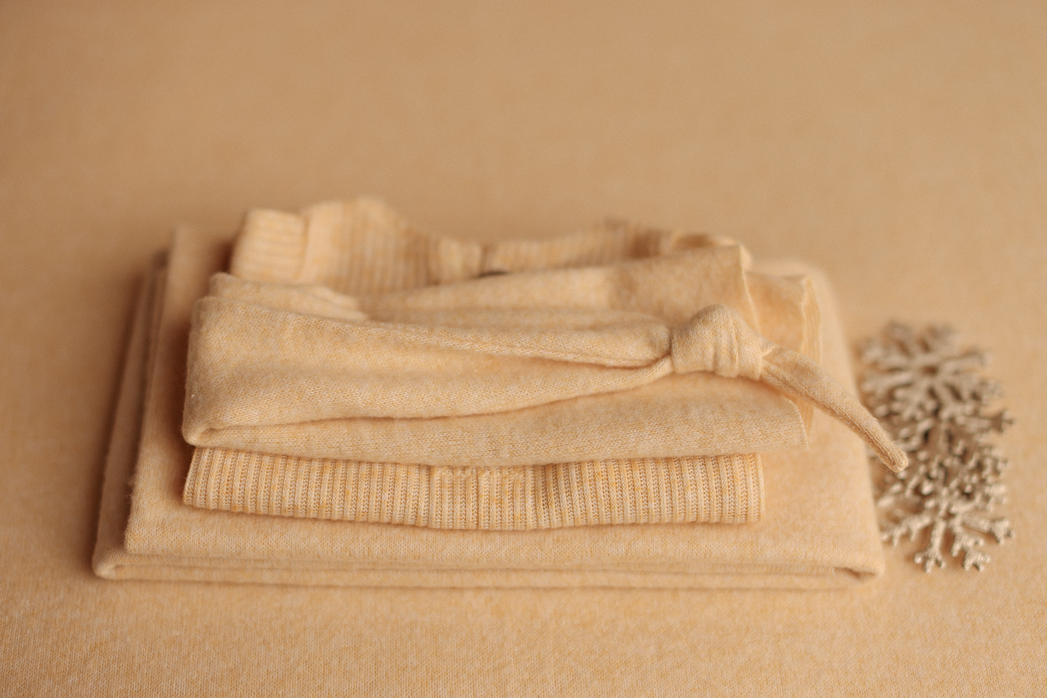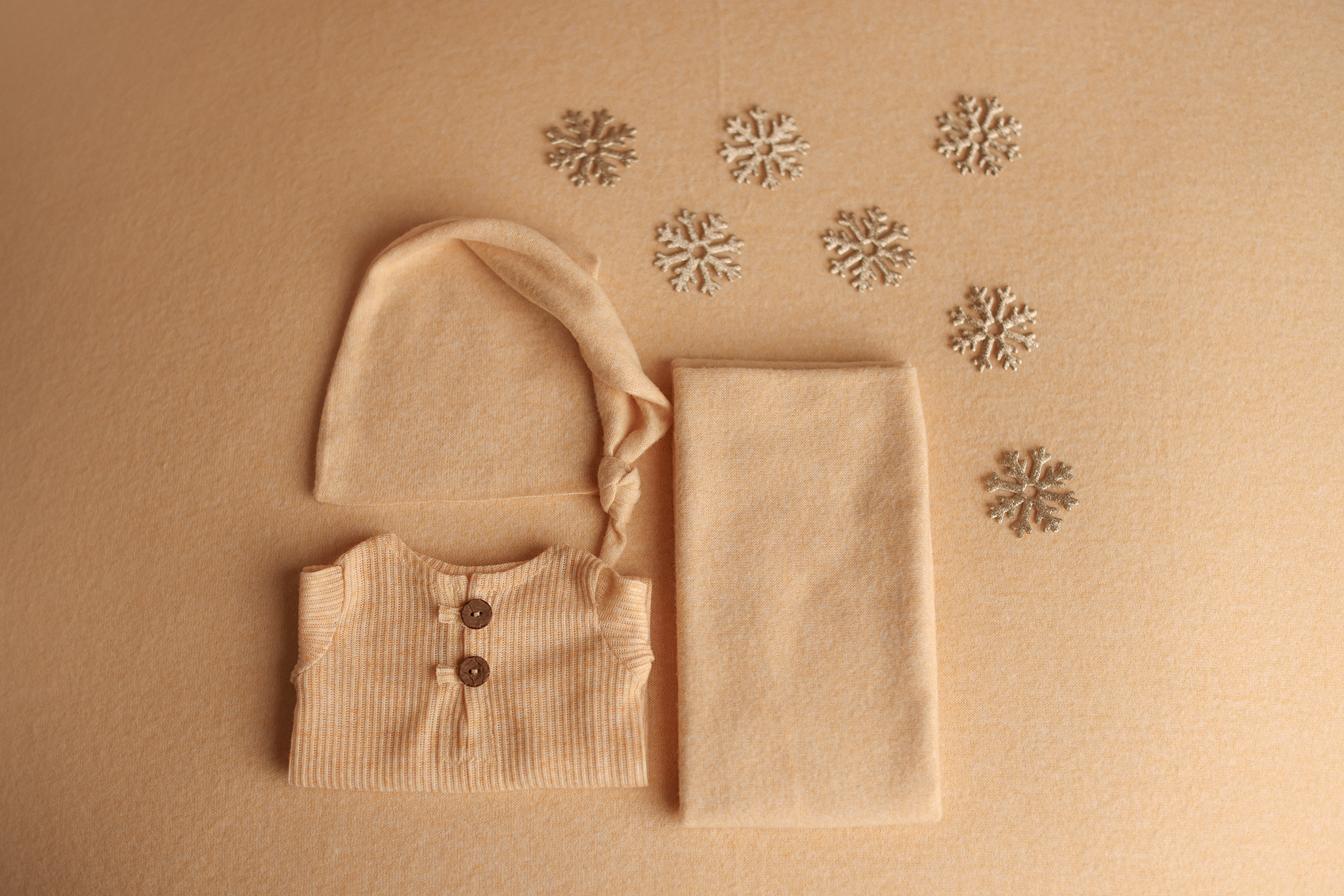 hand-sewn nb size onesie, hat, backdrop,wrap and snowflakes