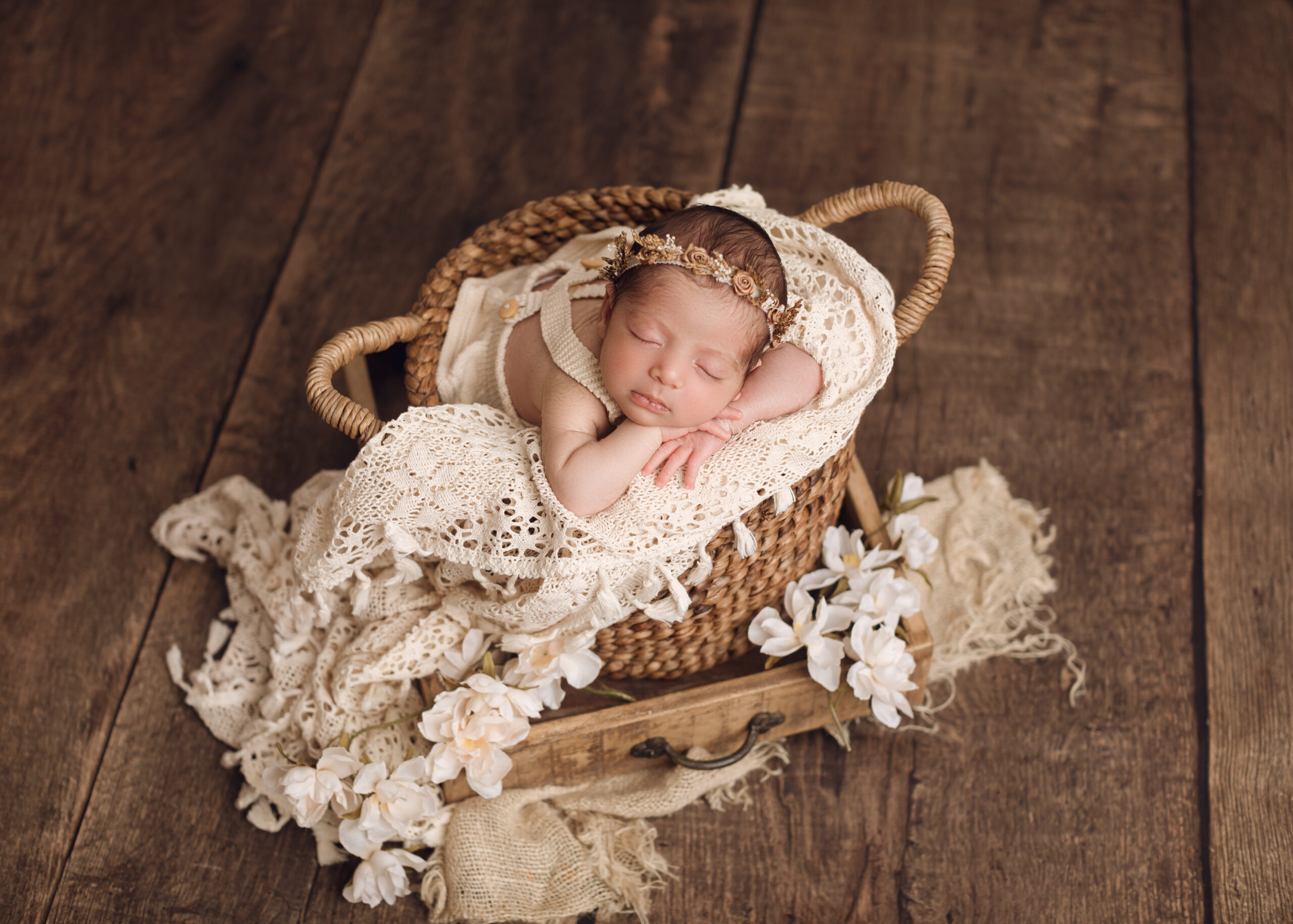 A cozy, handwoven basket with rich chestnut tones and charming twisted handles, perfect for snuggly newborn poses. Its deep, round shape offers both style and support, making it a beautiful go-to for timeless, earthy setups.