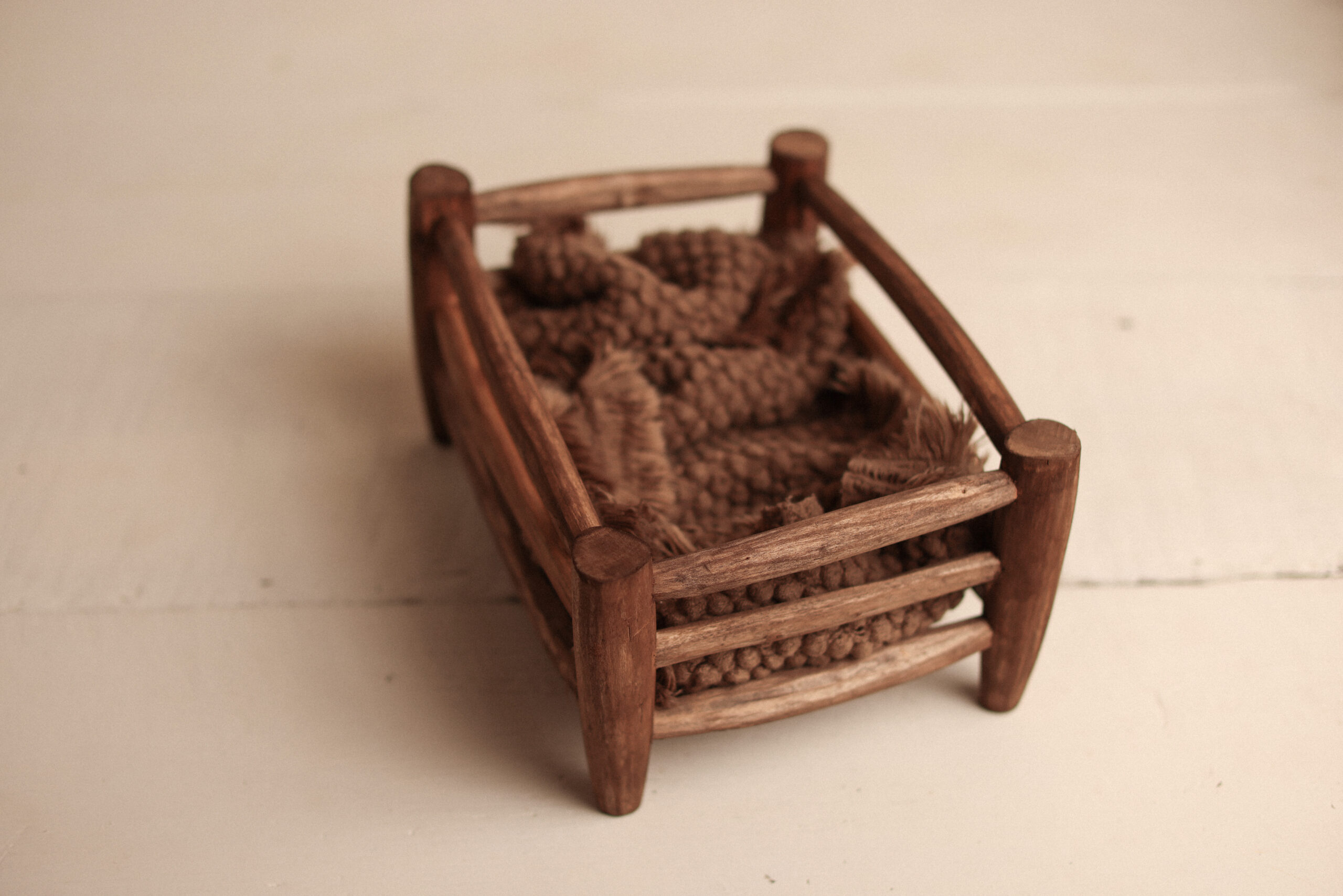 A little bed with all the charm of a countryside cottage. Handcrafted from raw wood with rounded edges and gentle curves, this piece brings a natural, homey feel to your newborn setups. Its simple, rustic construction feels like something plucked from a vintage storybook, perfect for soft knits, florals, or timeless neutrals.