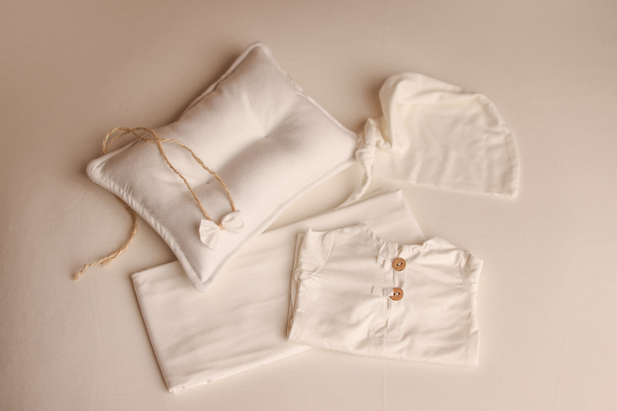 hand-sewn nb size outfit, pillow, backdrop & wrap