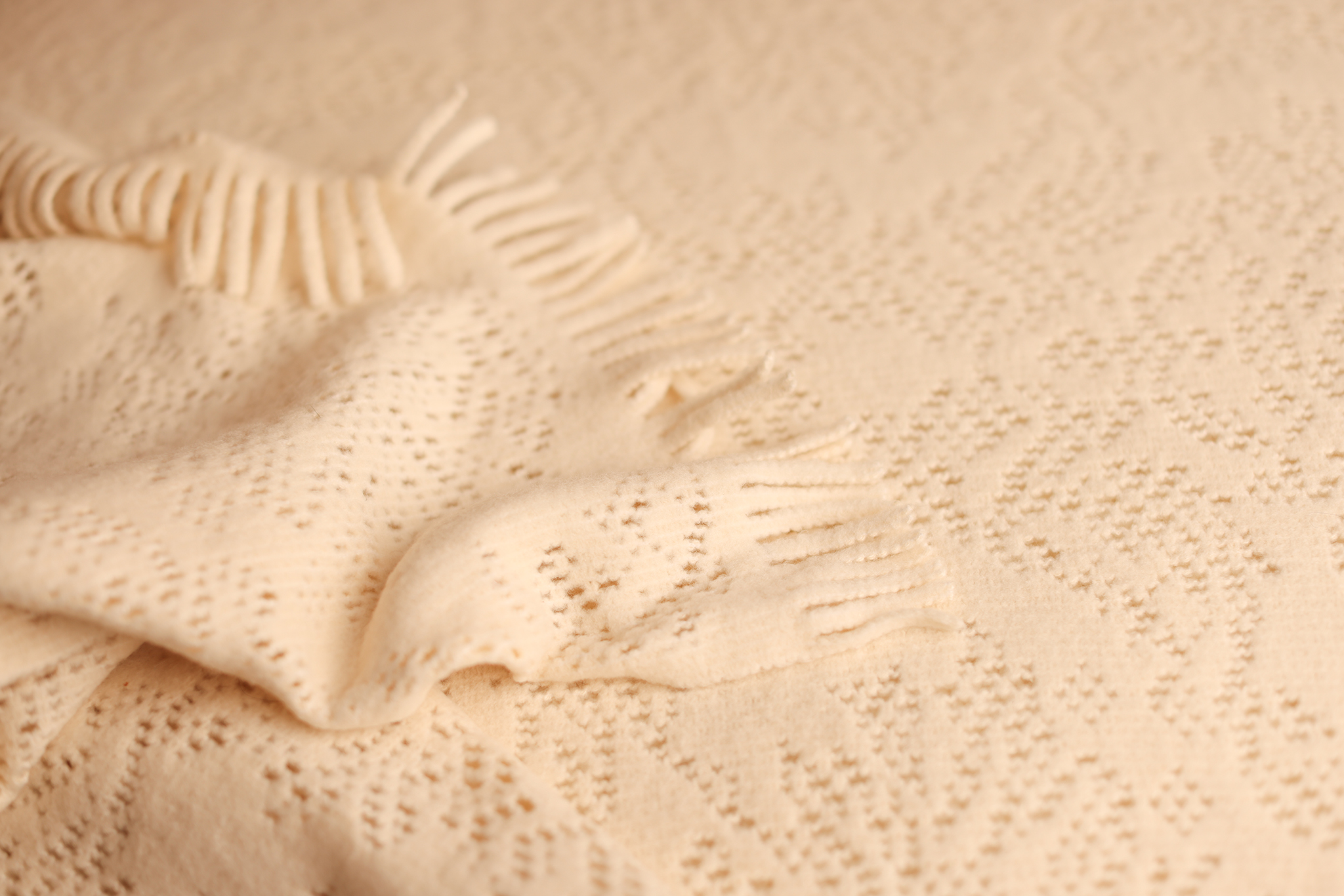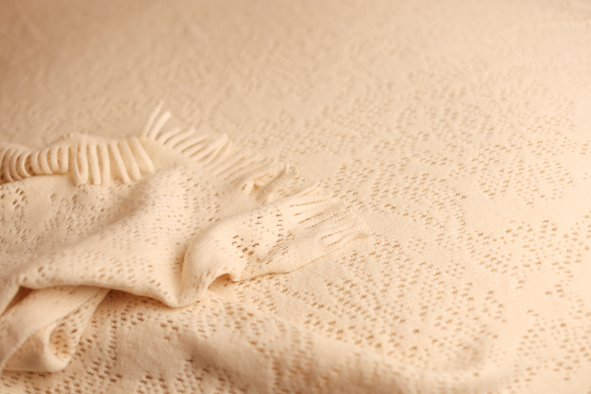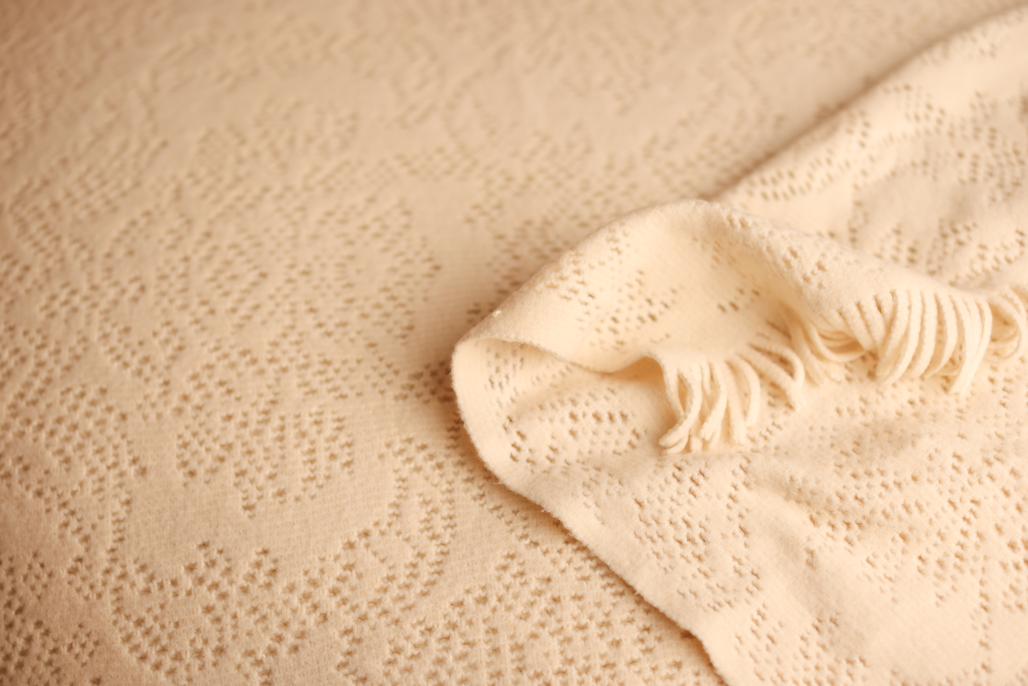This backdrop combines the coziness of a knit with the refinement of a lace-inspired texture. Tiny dotted motifs form a flowing, almost botanical pattern across the surface, adding a whisper of detail while keeping the overall look soothing and minimal. The creamy tone photographs beautifully with all skin tones, and the fringed edge adds a handmade charm. Ideal for creating timeless newborn photos with a soft, dreamy atmosphere.