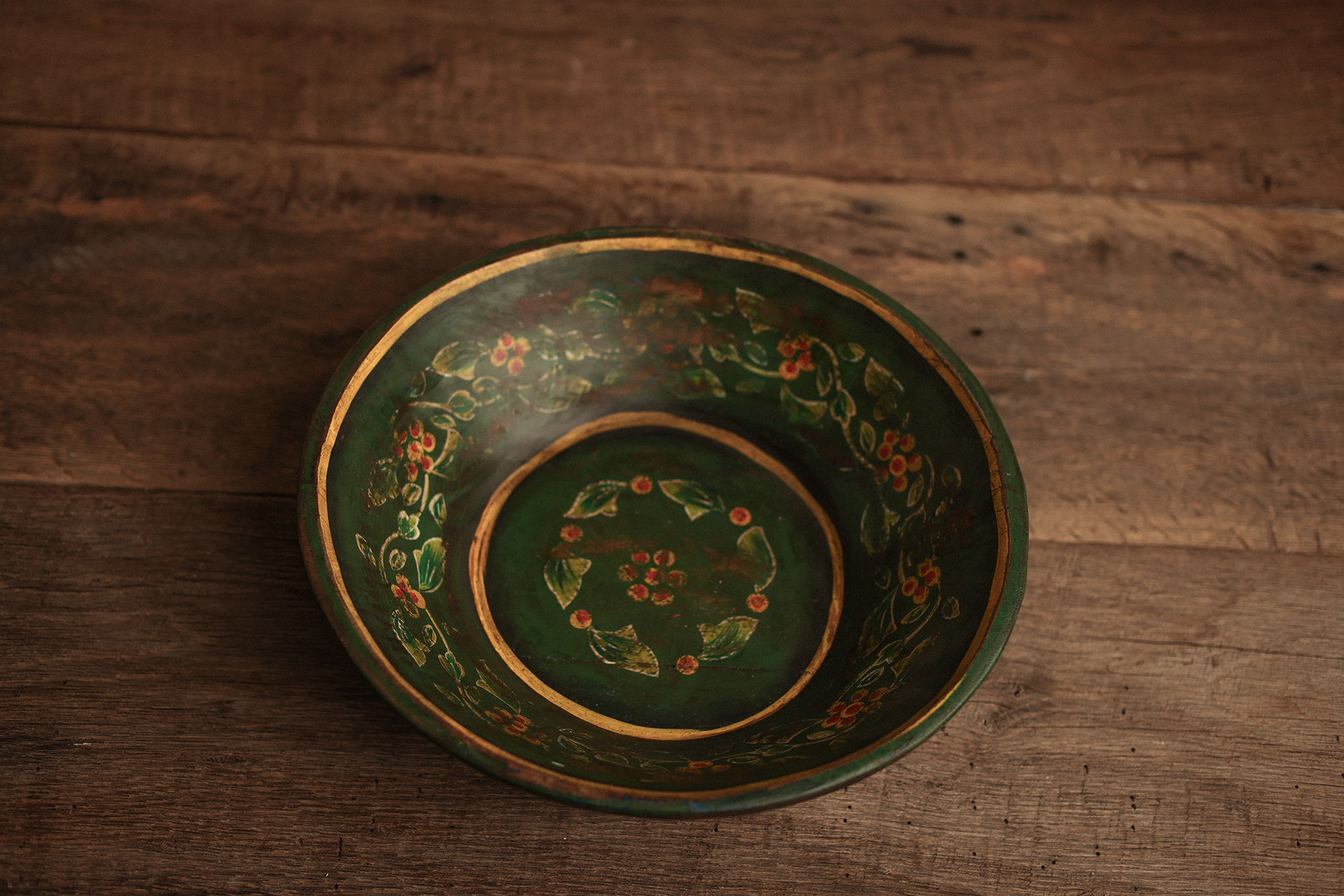 a one-of-a-kind vintage treasure, hand-painted in deep forest green with delicate golden accents and tiny red floral details.